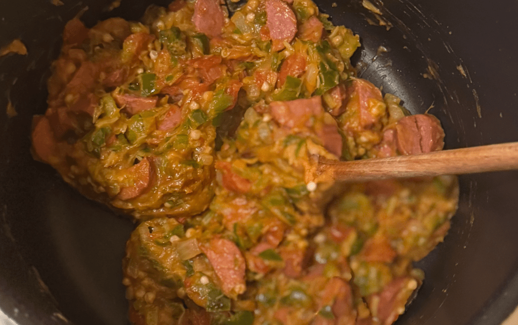 I had intended to follow the recipe as is. I almost always do that when I prepare a dish for the first time. Two reasons – I can critique it fairly and I know if it’s worthwhile trying my own take on it. So I had some smoked sausage in the freezer that I wanted to use up. Sorry andouille. Maybe next time. Otherwise I kept things as they were. It’s a labor-intensive dish the first time you make it and there is a lot of simmer/cook/fry for 10 minutes which all add up.